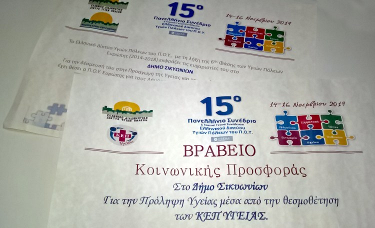 Δύο βραβεία απέσπασε ο Δήμος Σικυωνίων στο πλαίσιο του 15ου Πανελλήνιου Συνεδρίου του Ελληνικού Δικτύου Υγιών Πόλεων. Τα βραβεία του αφορούσαν στην Κοινωνική Πολιτική που ασκεί μέσω της δέσμευσή του στην Προαγωγή της Υγείας και την εκπλήρωση των κριτηρίων που έχει θέσει ο Παγκόσμιος Οργανισμός Υγείας (Ευρώπης).
