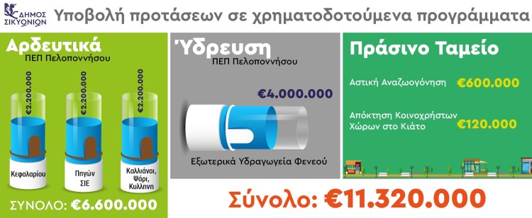 Σήμερα ο δήμος Σικυωνίων έχει Τεχνικό Πρόγραμμα που υπερβαίνει τα 16 εκατ. ευρώ και αναμένεται με τις νέες εντάξεις έργων και τις τροποποιήσεις που θα γίνουν μέσα στο έτος να εκτιναχθεί στα 24 εκατ. ευρώ. Η ΔΕΥΑΣ έχει προγραμματίσει για το 2020 έργα ύψους 11εκατ. ευρώ, τα οποία θα φτάσουν τα 17 εκατ. ευρώ με την ένταξη νέων έργων μέσα στο έτος.