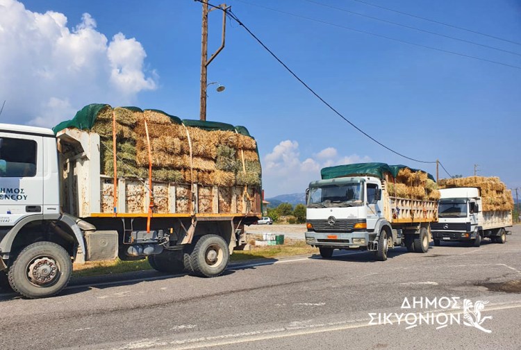 Στη Γορτυνία και συγκεκριμένα στα Τρόπαια βρέθηκαν χθες Παρασκευή 20 Αυγούστου τρία φορτηγά του Δήμου Σικυωνίων, τα οποία μετέφεραν ζωοτροφές για τα αιγοπρόβατα των πυρόπληκτων περιοχών.